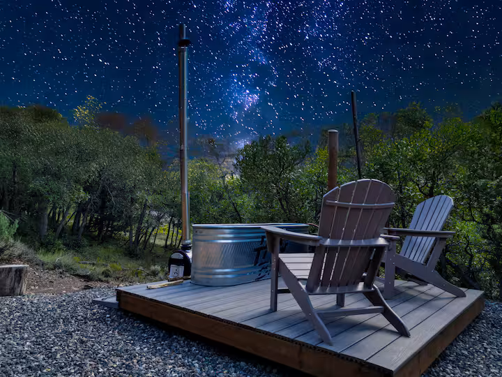 The whole process — fill, fire, heat — takes about 1.5 to 2 hours. Start as the sun gets low and you'll slip into a hot tub right as the sky goes dark. At almost 8,000 ft in a dark sky corridor, the Milky Way comes out roughly 90 minutes after sunset. Step away from your screen for 15–20 minutes and let your eyes fully adjust — the difference is dramatic.